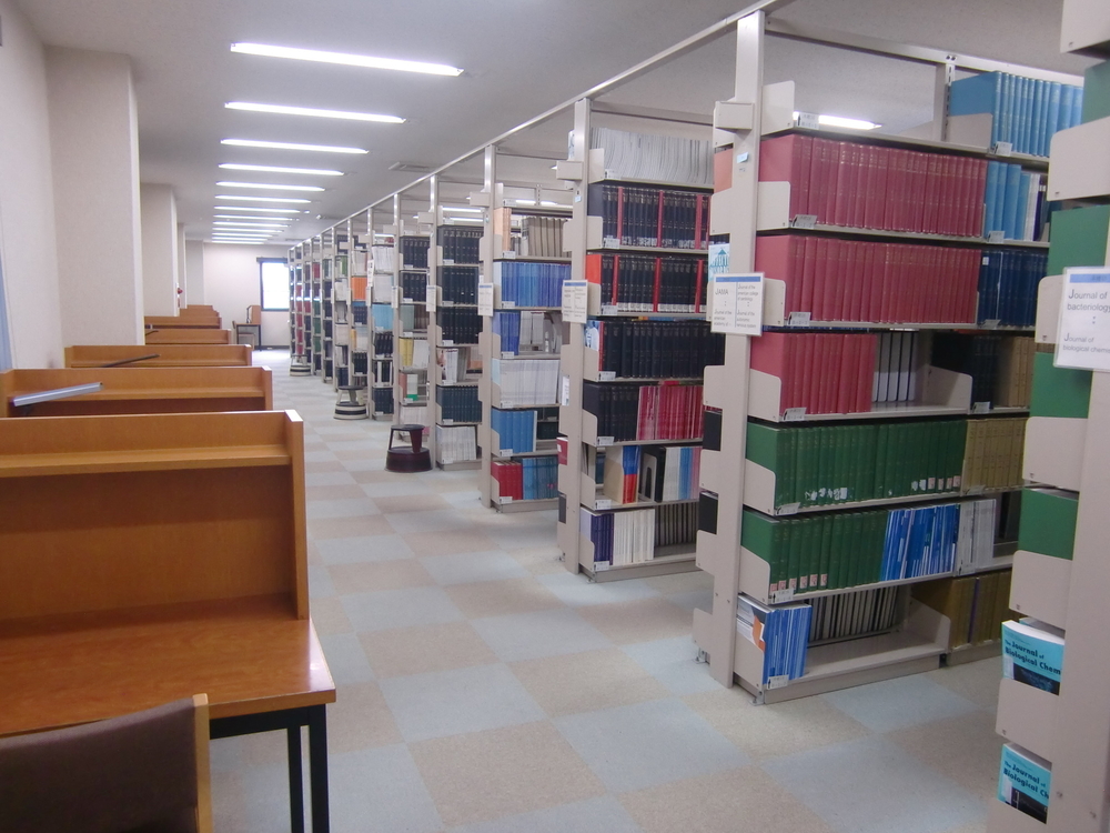 こちらは、階段を2階に上って左手の、フリースペースで貴重書を展示しているコーナーです。現在は、以前に卒業生の方から寄贈された、トーマス・アジソンとリチャード・ブライトの図書を展示しています。