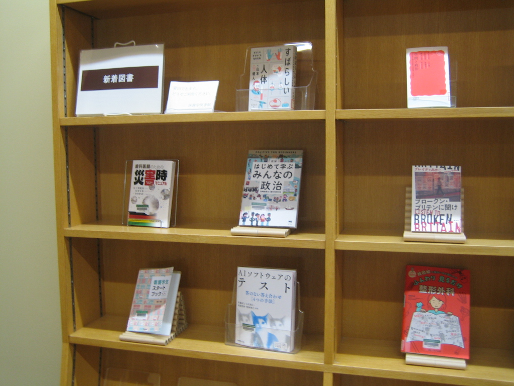 こちらは階段を2階に上ってすぐのところにある、新着図書の展示コーナーです。